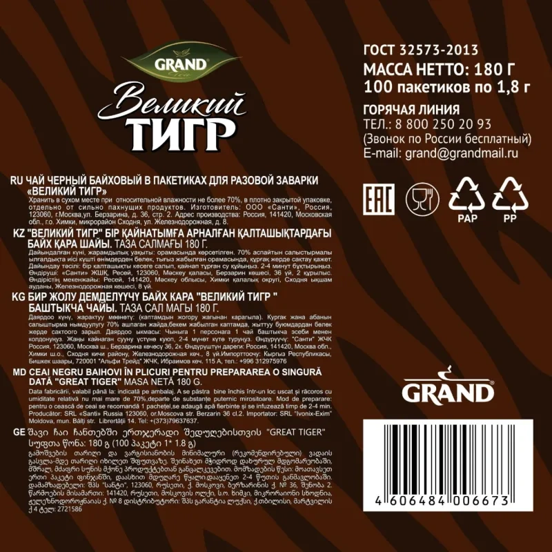 Чай Grand Великий Тигр, черный, 100 пакетиков