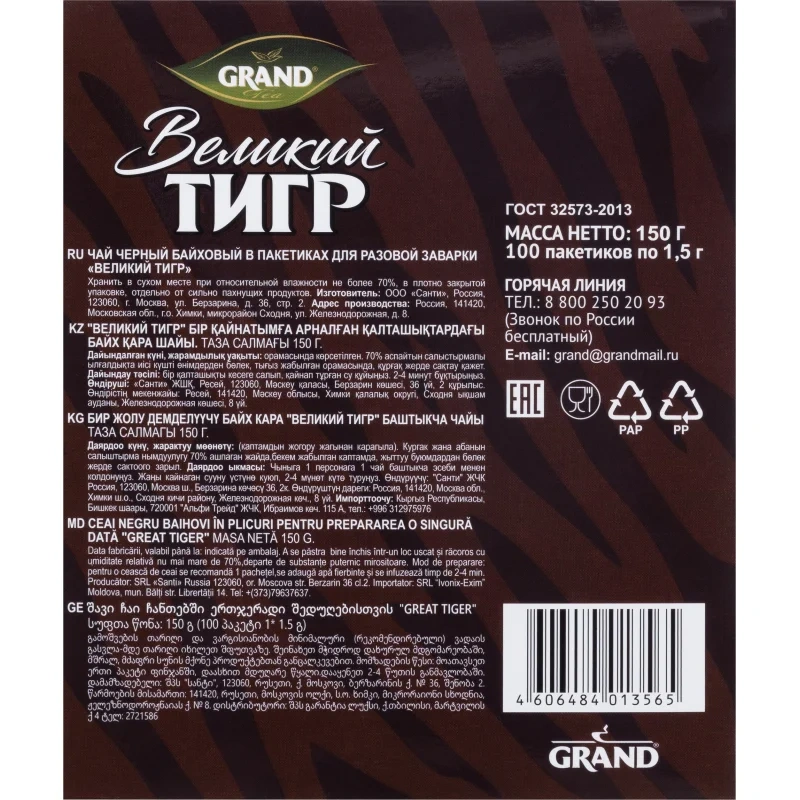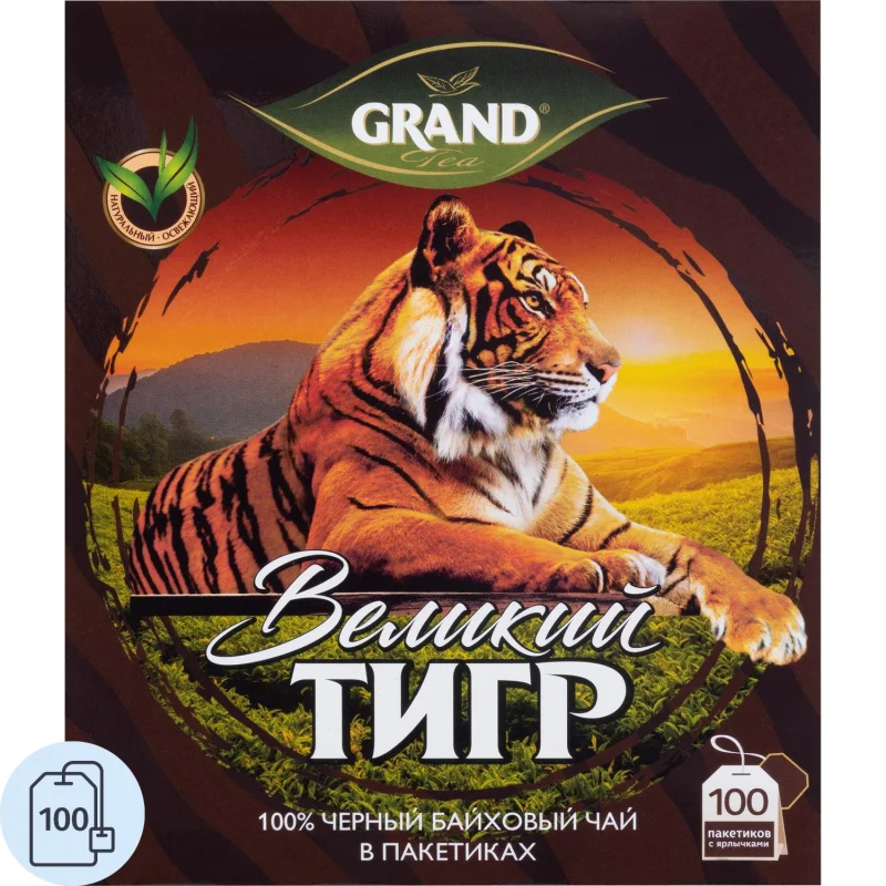 Чай черный Grand Великий Тигр 100 пакетиков с ярлычком. Чай Grand «Великий Тигр» 100 пакетиков — черный байховый чай с насыщенным цветом и умеренно терпким вкусом — дарит заряд бодрости и энергии, создан для ежедневных чаепитий как в офисе, так и дома. Чашка чая Grand поможет сконцентрироваться на решении ключевых задач, восстановить энергию и работоспособность, будет поводом собрать за столом родных, коллег или разделить радость встречи с друзьями.