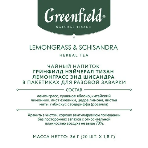 Чай травяной Greenfield Natural Tisane Lemongrass & Schisandra 20 пакетиков. Чай на основе тайского лемонграсса с сочной кислинкой лимонника китайского (шисандры). Сладкий, освежающий. Это первая в мире комбинация таких ярких и самостоятельных ингредиентов в одном купаже. Тайский, богатый цитрусовыми эфирами лимонник, белый легкий кислинкой гибискус, сладкая балансирующая кислотность купажа китайская ежевика. Настоящая азиатская бомба мирового уровня!