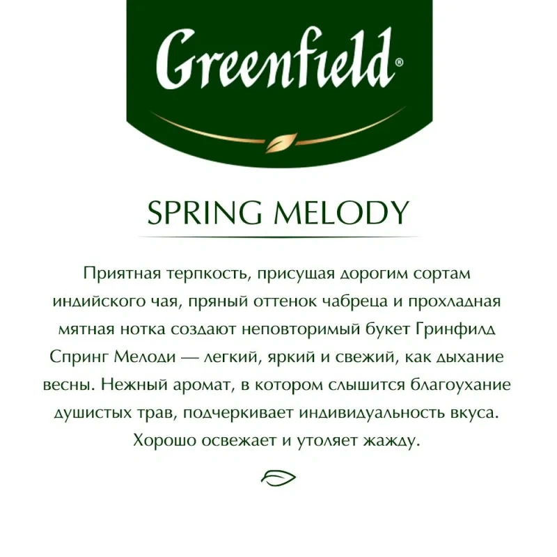 Чай черный Greenfield Spring Melody 100 пакетиков (черная смородина, мята, чабрец). Черный чай Greenfield Spring Melody с ароматов фруктов и душистых трав изготовлен из дорогого индийского чая, листьев смородины и мяты. Пряный насыщенный вкус чабреца в сочетании с нотками прохладной мяты создают неповторимую композицию чая Greenfield Spring Melody, прекрасно утоляющую жажду. Черный чай Greenfield Spring Melody расфасован в 100 бумажных пакетиков, каждый из которых помещен в упаковку из фольги. Фольга идеально сохраняет свойства чая, препятствует отсыреванию и попаданию посторонних запахов, защищает продукт от света. Упаковка из 100 пакетиков черного чая Greenfield Spring Melody идеально подходит для чаепития в офисе.