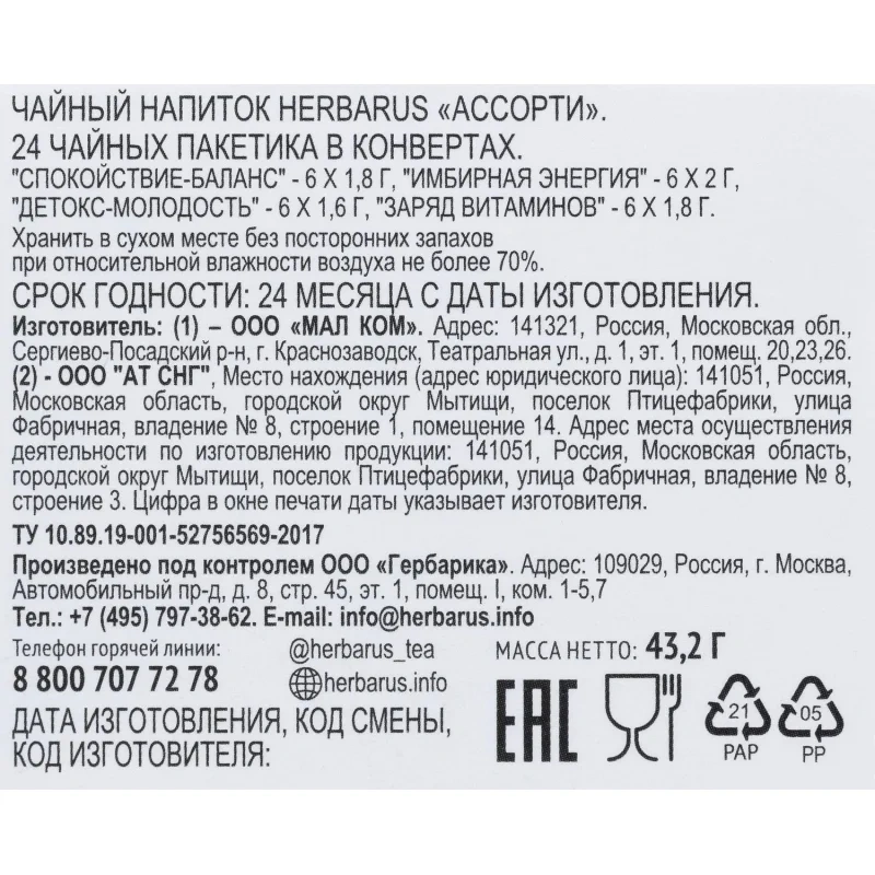 Чайный напиток ассорти Herbarus 24 пакетика. Чайный напиток Herbarus ассорти 24 пакетика — это яркий неповторимый вкус и только натуральные ингредиенты. Оригинальная композиция создана на основе чая, трав, ягод и фруктов. Их полезные свойства дополняют друг друга — чтобы вы могли пить чай в течение всего дня. Сколько хотите!