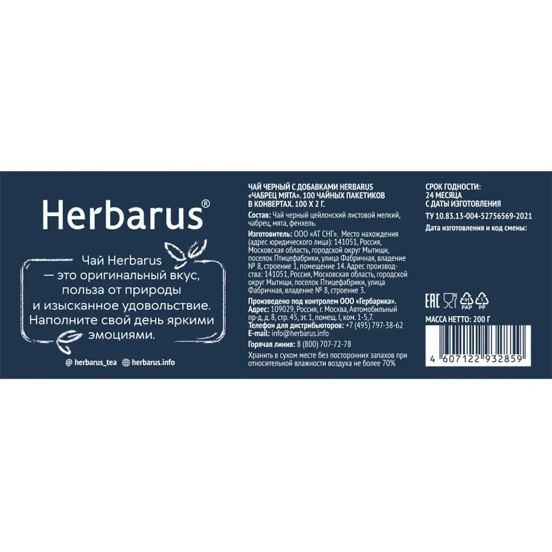 Чай Herbarus Черный с чабрецом и мятой. Это изысканное сочетание черного чая, чабреца, фенхеля и мяты. Напиток обладает насыщенным вкусом с освежающим послевкусием. Подходит для употребления как в горячем, так и в охлажденном виде.