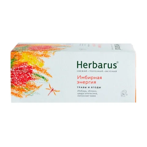 Чайный напиток имбирный Herbarus Имбирная энергия 24 пакетика. Чайный напиток Herbarus «Имбирная Энергия» 24 пакетика по 2 грамма — приятное пожелание на каждом ярлыке пакетика. Сочетается с медом и лимоном. Сначала бодрит, потом расслабляет. Согревает, улучшает обмен веществ, защищает от простуд, наполняет энергией. Можно пить в любое время дня.