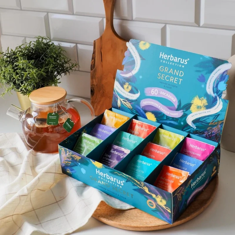 Подарочная лимитированная коллекция Herbarus Secret Collection. Это набор чая и чайных напитков «Чайное ассорти Grand Secret». Подходит для наслаждения уникальными вкусами и дарения положительных эмоций. В набор входит 60 саше, 12 вкусов по 5 пакетиков каждого.