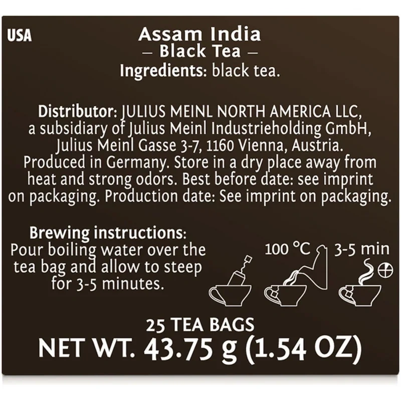 Чай черный Julius Meinl Assam India 25 пакетиков. Чай Julius Meinl «Accam» черный премиум пакетированный (25 пакетиков в упаковке) — знаменитый черный чай из индийского штата Ассам. Отличается яркостью вкуса, янтарным оттенком настоя и легким солодовом послевкусием.