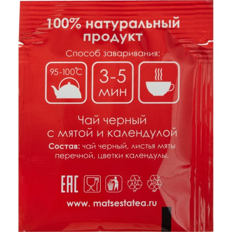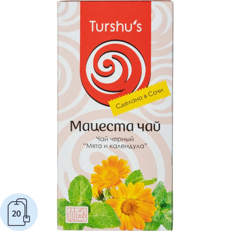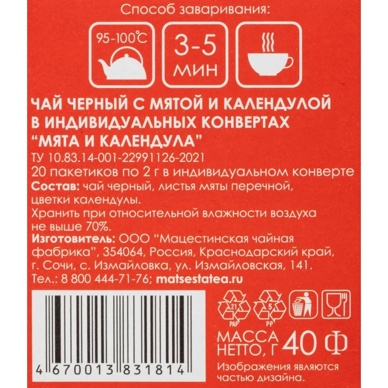 Чай черный Мацеста 20 пакетиков (календула, мята). Этот купаж дает Вам возможность наслаждаться вкусным, полезным и абсолютно натуральным продуктом. Черный классический чай, выращенный в экологически чистой зоне среди горных массивов Кавказского хребта, имеет насыщенный сбалансированный вкус с карамельными оттенками и богатый аромат. Листья мяты вносят в него свежую ноту. Дополняют ансамбль цветки календулы. Календула и мята - хорошие помощники при простуде. Чай не содержит ароматизаторов и красителей.Состав: чай черный байховый, листья мяты перечной, цветки календулы.Способ приготовления: залить чай кипятком, дать чаю настояться 3-5 минут.Количество пакетиков в упаковке: 20 штук.Тип упаковки: картонная коробка.Условия хранения: хранить в чистом, хорошо вентилируемом помещении без посторонних запахов при относительной влажности воздуха не более 70%.Страна производства: Россия.