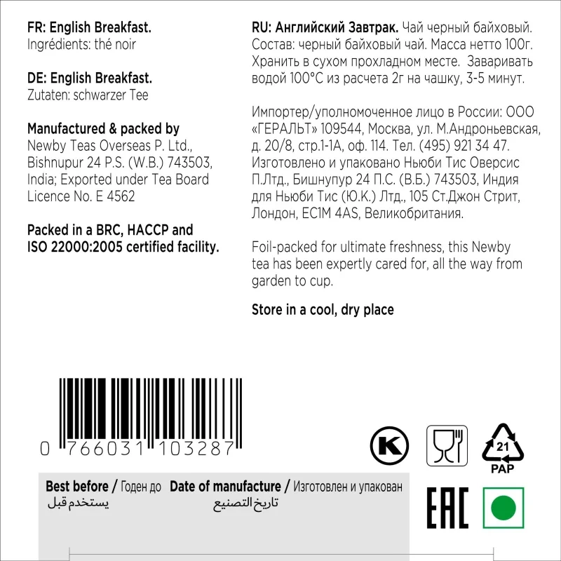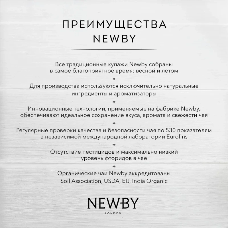 Чай листовой черный Newby English Breakfast 100 г. Популярная смесь черных сортов чая из Ассама, Цейлона и Кении. Крепкий чай, идеален для начала дня. Насыщенный настой янтарного цвета с солодовым ароматом и слегка пряным послевкусием.