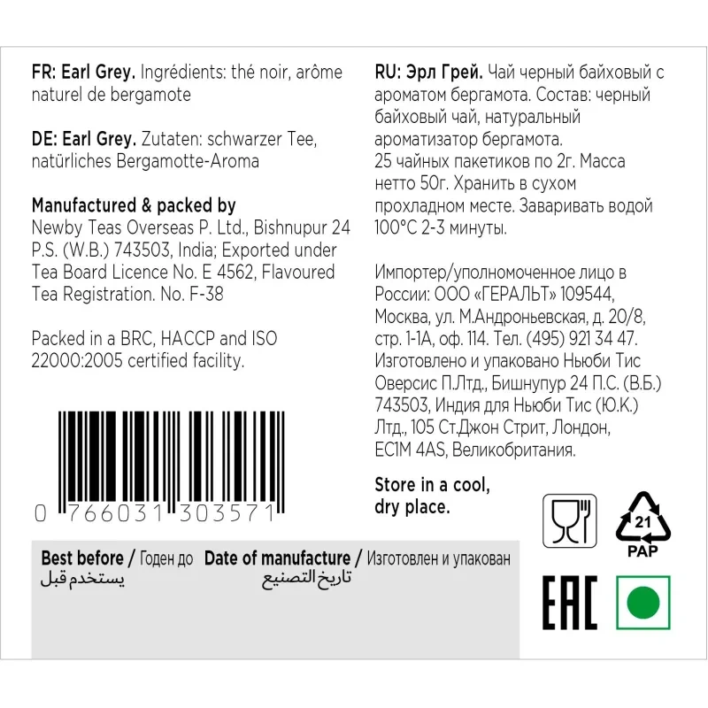 Чай черный Newby Earl Grey 25 пакетиков (бергамот). Знаменитый черный чай с освежающими цитрусовыми нотками. Эрл Грей, названный в честь британского премьер-министра, несомненно, является любимым чаем англичан. Черный чай, ароматизированный натуральным маслом бергамота, при заваривании дает сбалансированный настой яркого цвета с приятным шелковистым послевкусием.
