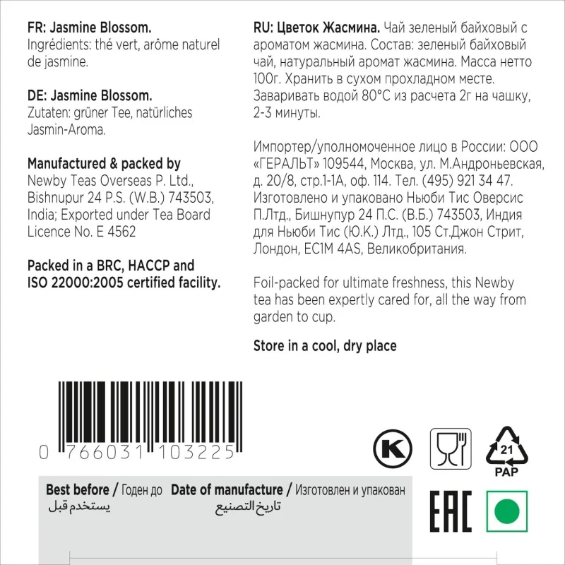 Чай листовой зеленый Newby Jasmine Blossom 100 г (жасмин). Классический зеленый чай с нежным ароматом жасмина. Яркий желтовато-медовый настой с легким ароматом жасмина и деликатным сладким послевкусием.