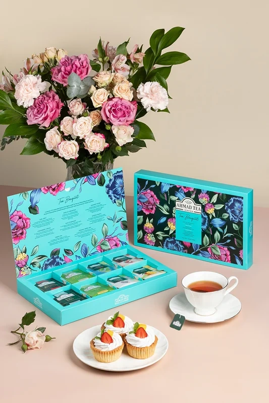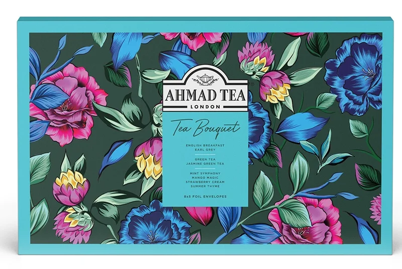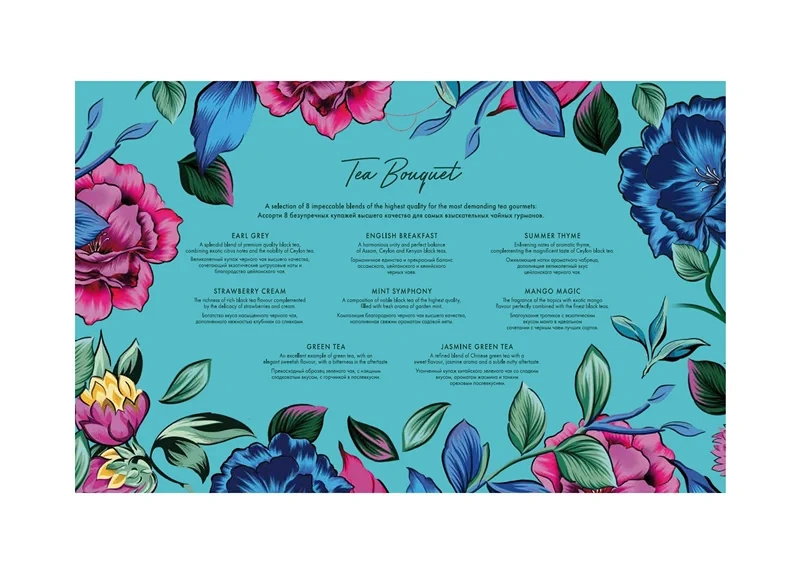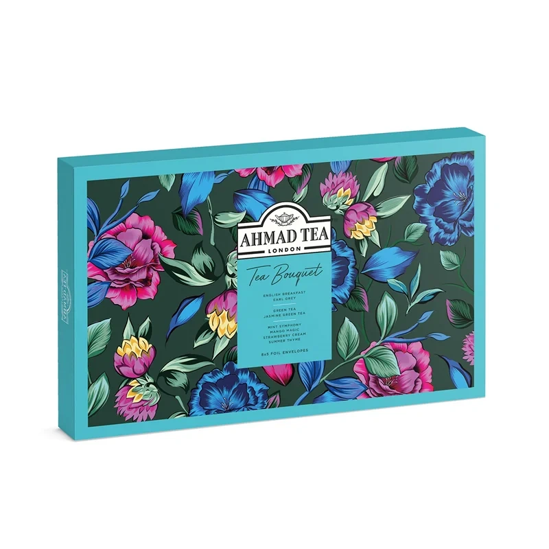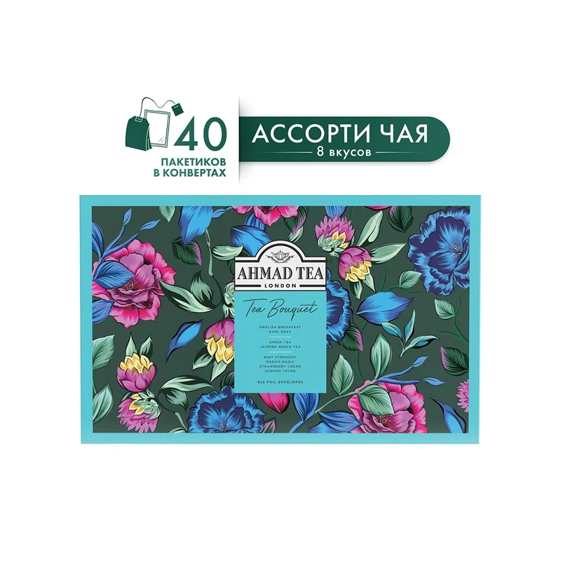 Tea Bouquet - ассорти 8 безупречных купажей высшего качества для самых взыскательных чайных гурманов. Набор чая из 8 вкусов (40 индивидуальных пакетиков). Сделайте подарок близким, насладитесь сочными вкусами наедине с собой и вдохновляйтесь новыми открытиями вместе с Ahmad Tea.