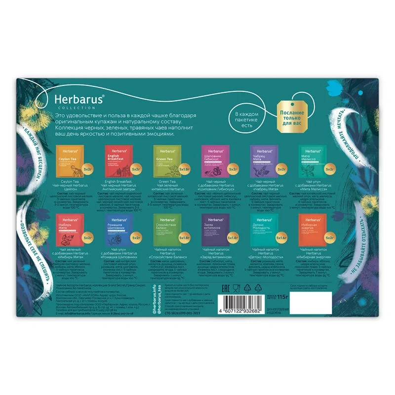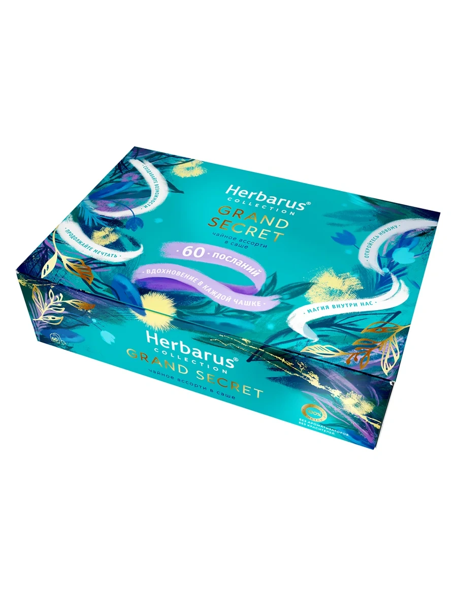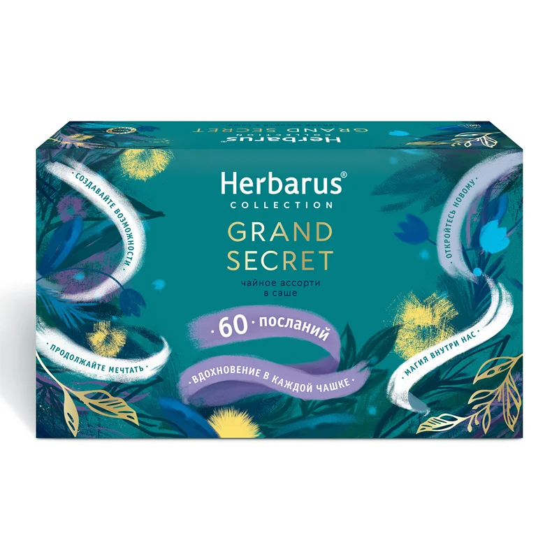 Перед вами чай и чайные напитки из подарочной лимитированной коллекции Herbarus Secret Collection. Этот чай - наслаждение уникальным вкусом и эмоциями от добрых слов. Мы собираем травы вручную и нарезаем только перед смешиванием – так мы сохраняем их природную пользу и свежесть. В чае только натуральные травы и ягоды в составе. Без искусственных добавок и ароматизаторов. Без кофеина. Удовольствие в каждой чашке благодаря богатому, яркому аромату и вкусу. Авторский купаж от первоклассного титестера и эксперта в травах. Набор популярных вкусов в одной упаковке Чайное Ассорти Grand Secret позволит познакомиться с неповторимыми купажами.