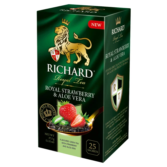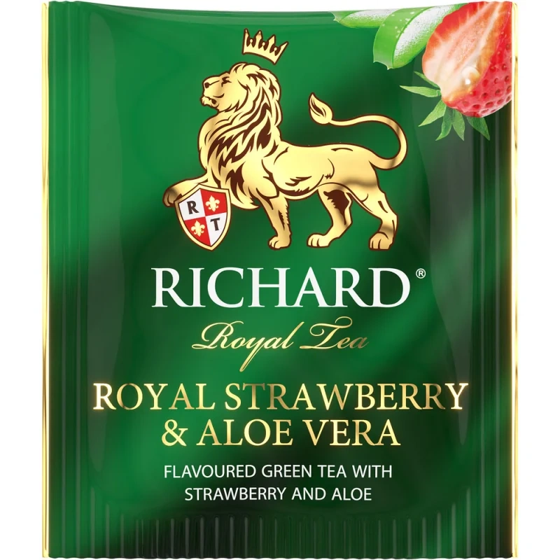 Чай Richard зеленый клубника-алоэ, 1.5г x 25 — ароматный китайский напиток в красивой упаковке. Напиток пользуется высоким спросом и популярностью у истинных ценителей хорошего чая. Цвет чая зеленоватый, в аромате и вкусе присутствует горчинка и нежная сладость клубники и алоэ. Напиток прекрасно подойдет для ежедневного и праздничного чаепития, подается с сахаром, молоком или сгущенкой, вареньем, медом. Чай прекрасно тонизирует, улучшает метаболизм, подходит для диабетического стола. Небольшую упаковку удобно брать с собой в командировку, поездку, пикник, чтобы не отказывать себе в удовольствии насладиться чашечкой ароматного напитка.