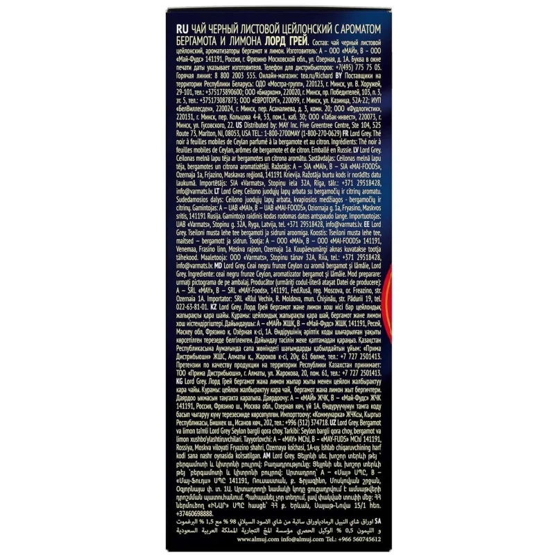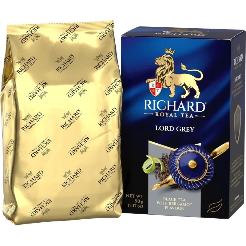 Чай листовой черный Richard Lord Grey 90 г (цитрус, бергамот). Чай Richard Lord Grey черный - изысканный купаж элитных сортов цейлонского чая с ароматом бергамота и лимона, цедрой цитрусовых. Весовой 90 грамм.Состав: чай черный байховый цейлонский.Способ приготовления: залить в заварочном чайнике кипятком и настоять 3-5 минут. Вес: 90 грамм. Тип упаковки: картонная коробка.Условия хранения: хранить в чистом, хорошо вентилируемом помещении без посторонних запахов при относительной влажности воздуха не более 70%.Страна производства: Россия.