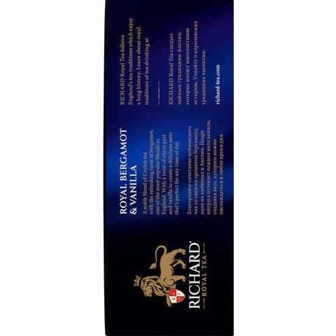 Чай черный Richard Royal Bergamot & Vanilla 100 сашет. Благородное сочетание цейлонского чая с ароматом бергамота, цедрой цитруса и нежной ноткой ванили. Оригинальная композиция цейлонского чая с бергамотом и ароматом ванили.
