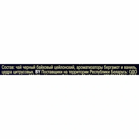Состав: чай черный байховый цейлонский, ароматизаторы бергамот и ваниль, цедра цитрусовых.