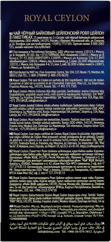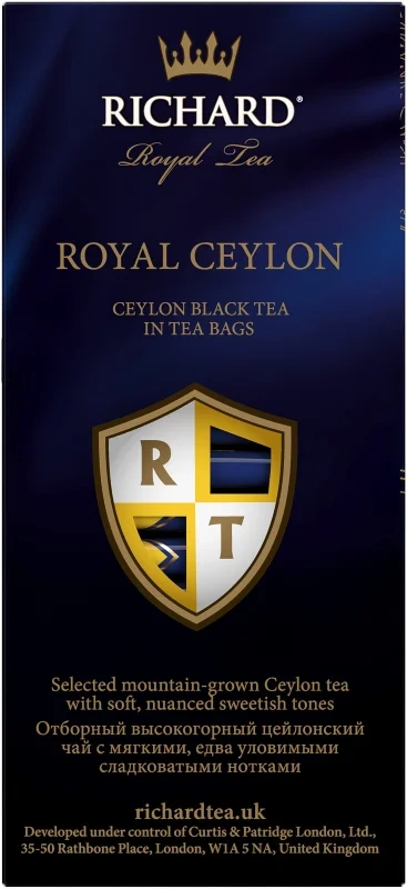 Чай черный Richard Royal Ceylon 25 сашет. Классический цейлонский черный чай высшего качества с мягкими едва уловимыми сладковатыми нотками. Классическая упаковка — 25 сашетов по 2 грамма с ярлыком. Изысканный экземпляр из Коллекции Королевского чая, блестящий сорт Richard Royal Ceylon, сохраняет истинный дух изысканного вкуса для истинных ценителей. Отборный цейлонский чай с нежными, едва уловимыми сладковатыми оттенками — предпочтение королей!