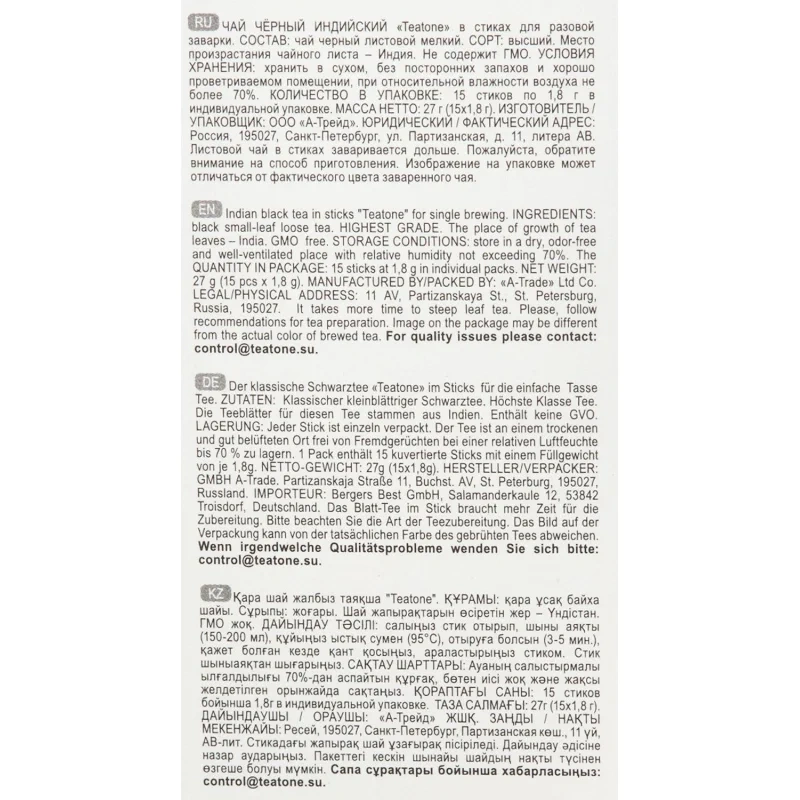 Чай Teatone Indian Black Tea, черный, 15 стиков