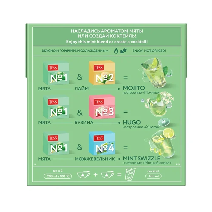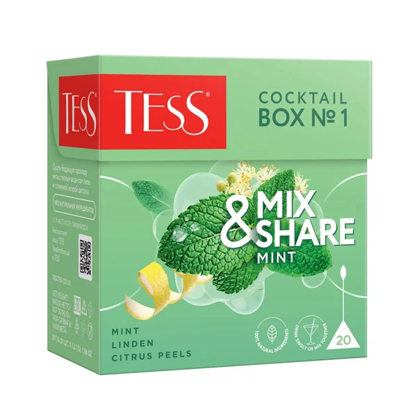 Чай травяной Tess Коктейль Бокс № 1 20 пирамидок (мята, липа). Ощутите бодрящую прохладу мяты с теплым акцентом липы и солнечной искрой цитруса. Наслаждайтесь нашей уникальной коллекцией из четырех натуральных купажей! Пробуйте вкусы по отдельности или завари две пирамидки из разных упаковок, чтобы смешать и получить 400 миллилитров коктейльного настроения для компании друзей.