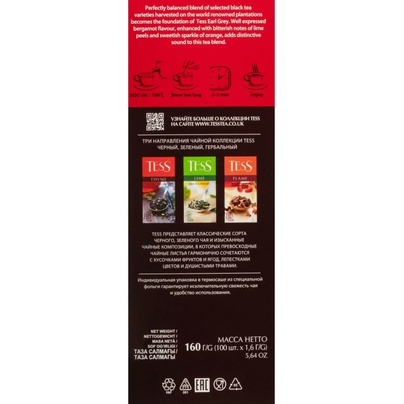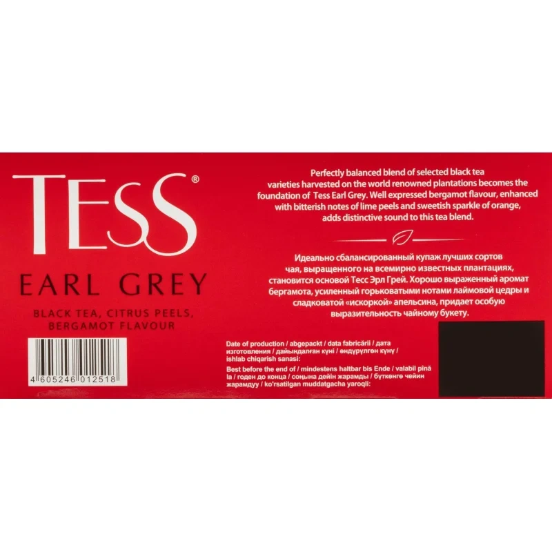 Чай черный Tess Earl Grey 100 пакетиков (бергамот). Чай Tess Earl Grey черный с цедрой лайма и ароматом бергамота 100 пакетиков — это замечательный купаж из отборных сортов чая с лучших плантаций мира с добавлением освежающего аромата бергамота и ярких, насыщенных оттенков цедры апельсина и лимона. Сочный и выразительный настой не оставит равнодушными поклонников десертных ноток в крепком, бодрящем чае. Чай с бергамотом заслужил особенное внимание и почет среди многих любителей горячего напитка. Солнечный цитрус лишь усиливает его прекрасный аромат и подчеркивает гармонию вкуса. Такой напиток подарит только теплые, счастливые и радостные моменты, раскрашивая повседневность в яркие краски и согревая в холодные дни. Tess Earl Grey станет чудесным дополнением небольших перекусов, послеобеденных чаепитий, редких встреч с друзьями и обсуждения будущих планов с коллегами и партнерами.