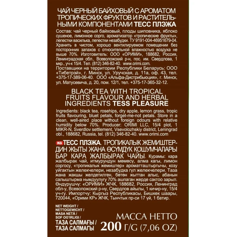 Состав: чай черный байховый, плоды шиповника, яблоко сушеное, лимонное сорго, ароматизатор «тропические фрукты», лепестки василька, лепестки незабудки.