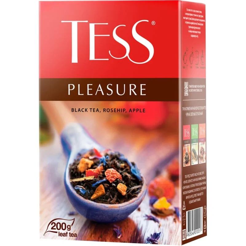 Чай листовой черный Tess Pleasure 200 г (яблоко, шиповник, тропические фрукты). Выразительная композиция из черного чая, шиповника, сушеных яблок, цветочных лепестков гармонично сочетает легкую пряность цейлонского чая, тонкие оттенки фруктов и нежный аромат с легкими цветочными и карамельными нотами.
