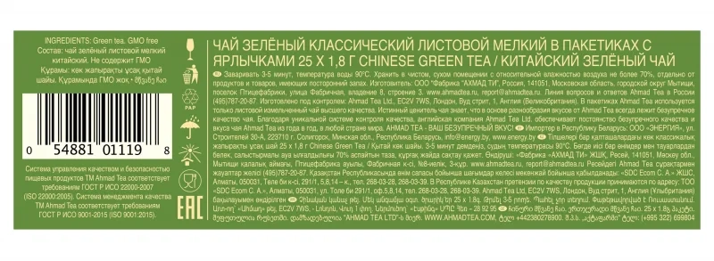Чай зеленый Ahmad Tea Китайский (1.8г x 25шт), 45г