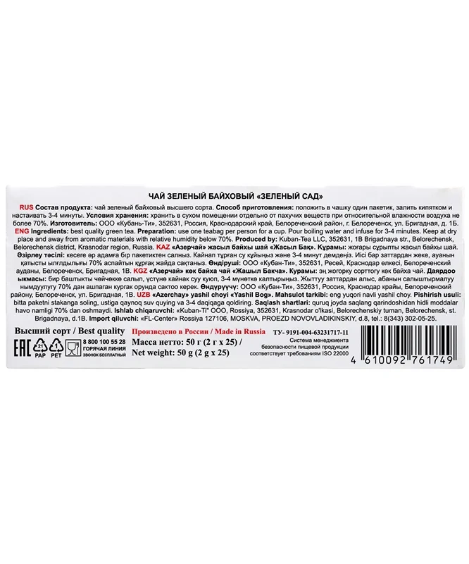 Чай Азерчай Зеленый сад, байховый, 25 пакетиков