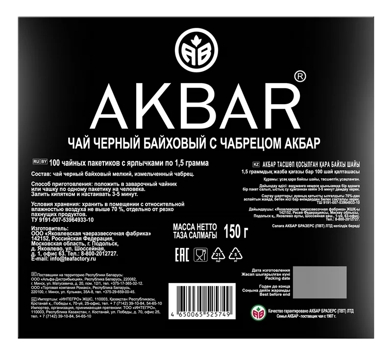 Чай черный Akbar чабрец пакетированный (1.5г x 100шт), 150г