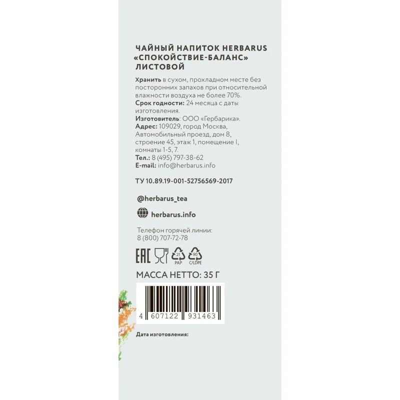 Чайный напиток травяной Herbarus Спокойствие баланс 35 г