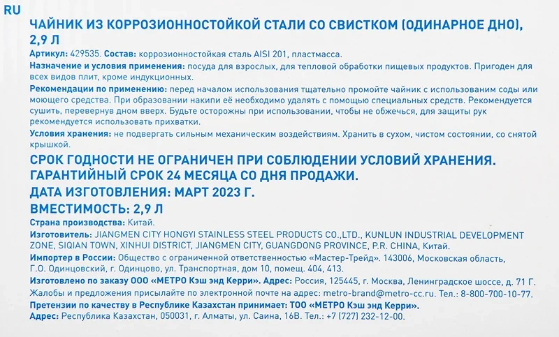 | Комплектация | чайник - 1 шт. |