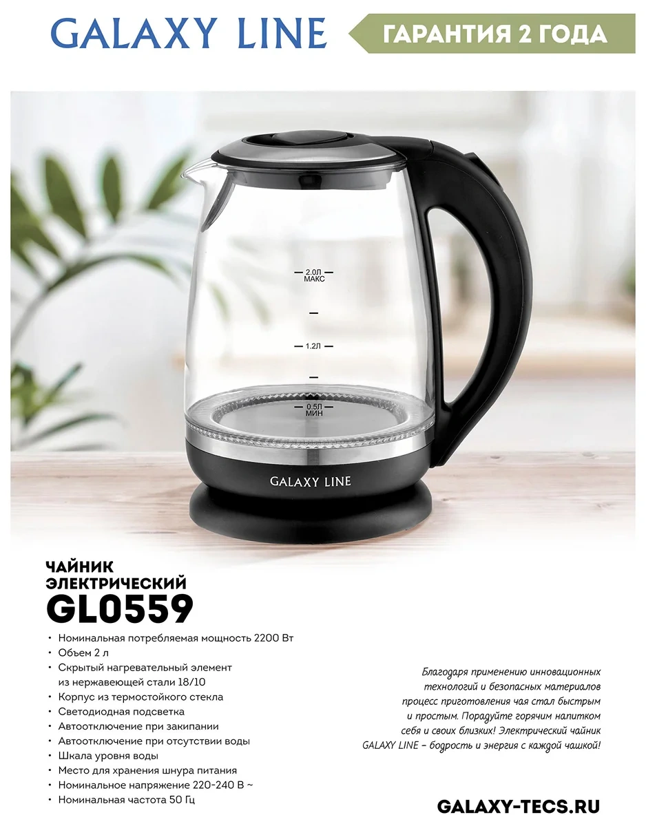 Чайник электрический Galaxy Line GL 0559 черный, 2л, 2200Вт