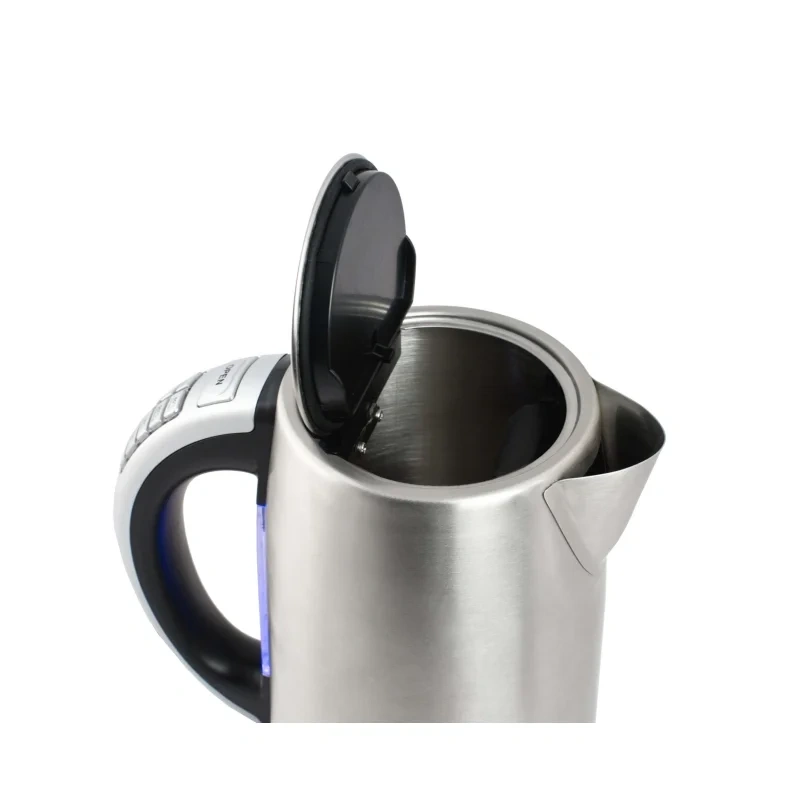 Чайник Gemlux GL-EK-9217WF регулировка температуры измерительная шкала фильтр от накипи отсек для шнура 1,7 л, 22,9 х 22,9 х 30 см — элегантный кухонный прибор, выполненный в минималистичном дизайне. Он гармонично впишется в интерьер любой современной кухни и не займет много места на столешнице. Его главное преимущество — электронное управление режимами кипячения. Ручка изделия оснащена панелью с кнопками, на которой вы можете выбрать подходящий температурный режим и поддержание температуры на одном уровне в течение 30 минут. Такая функция позволяет максимально раскрывать вкусы различных сортов чая, заваривая их при рекомендуемой температуре. Колба представленной модели рассчитана на максимальный объем 1,7 л — такой чайник идеально подходит для семьи из 3-4 человек. Встроенный в область носика съемный сетчатый фильтр улучшает качество воды, задерживая известковый осадок. Данное изделие изготовлено из нержавеющей стали, характеризующейся прочностью, экологичностью и безопасностью для здоровья. Термоизолированная ручка из пластмассы также покрыта нержавеющей сталью — она не нагревается и удобно лежит в руке. Задняя поверхность колбы оснащена прозрачной стеклянной вставкой, с нанесенной на нее четкой измерительной шкалой, позволяющей отслеживать уровень воды внутри. Чайник обладает мощностью 2000 Вт и доводит до кипения максимальный объем воды комнатной температуры всего за 6 минут. Скрытый нагревательный элемент не только продлевает срок службы прибора, но и облегчает уход за ним — он не накапливает на себе накипь. Производитель позаботился и о безопасности — изделие автоматически выключается при отсутствии воды, а также блокирует крышку во время работы.