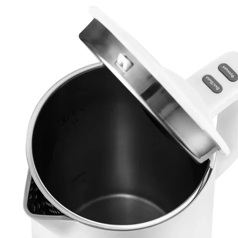 Чайник имеет широкое горлышко и легко открывается в 1 нажатие благодаря кнопке, расположенной наверху крышки. Его быстро и удобно наполнять водой и чистить в случае необходимости.