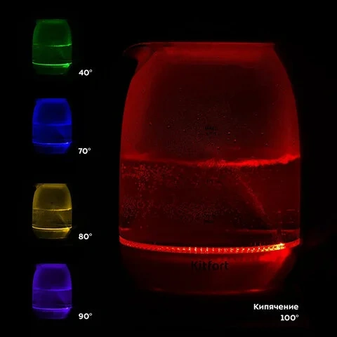 Чайник оснащён подсветкой, которая добавляет устройству стильности, и вращающейся подставкой на 360°, что делает его использование удобным.