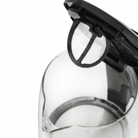 Корпус чайника выполнен из прозрачного стекла, что придаёт ему современный и элегантный вид, а крышка и подставка — из сочетания пластика и нержавеющей стали.