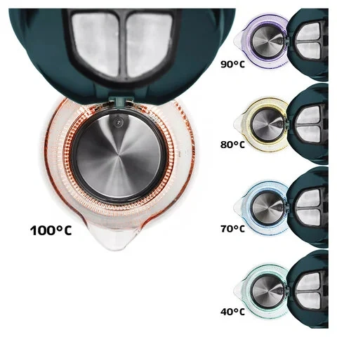 Чайник оснащён электронным терморегулятором и может нагреть воду от 40 до 100 °С, что очень удобно при заваривании различных сортов чая, приготовлении кофе и подогрева детского питания. Температура контролируется встроенным в дно чайника термодатчиком.