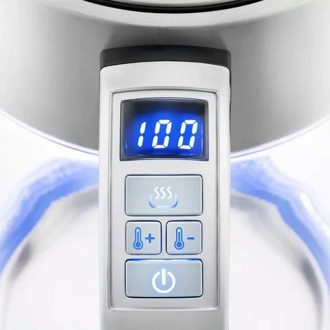 Управление чайником интуитивно понятно: на ручке расположен LED-дисплей, который отображает текущую и установленную температуру, а также кнопки включения, поддержания температуры и регулировки. Каждая кнопка оснащена световым индикатором, что делает использование чайника максимально удобным даже в темноте.