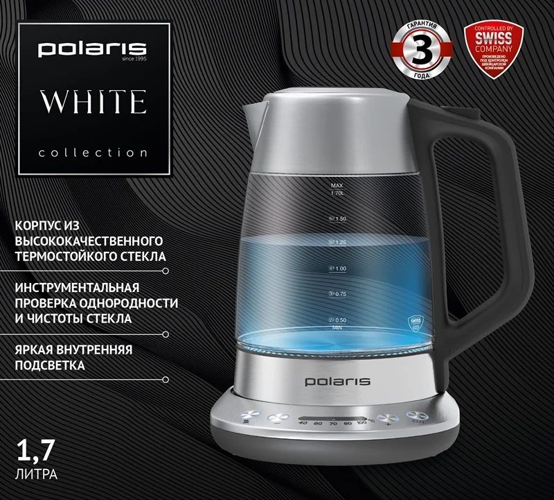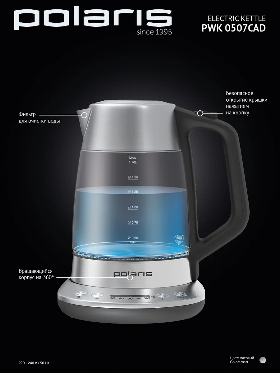Электрический чайник Polaris PWK 0507CAD –и прибор с возможностью выбрать температуру нагрева. На сенсорной панели управления доступен выбор 1 из 4 температурных режимов (40/70/80/100 градусов) и включение режима поддержания температуры. Установлен британский контроллер Strix, блокировка включения без воды.