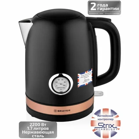 Чайник с термометром BRAYER BR1005BK, 1,7 л, 2200 Вт, закрытый нагревательный элемент, сталь, черный