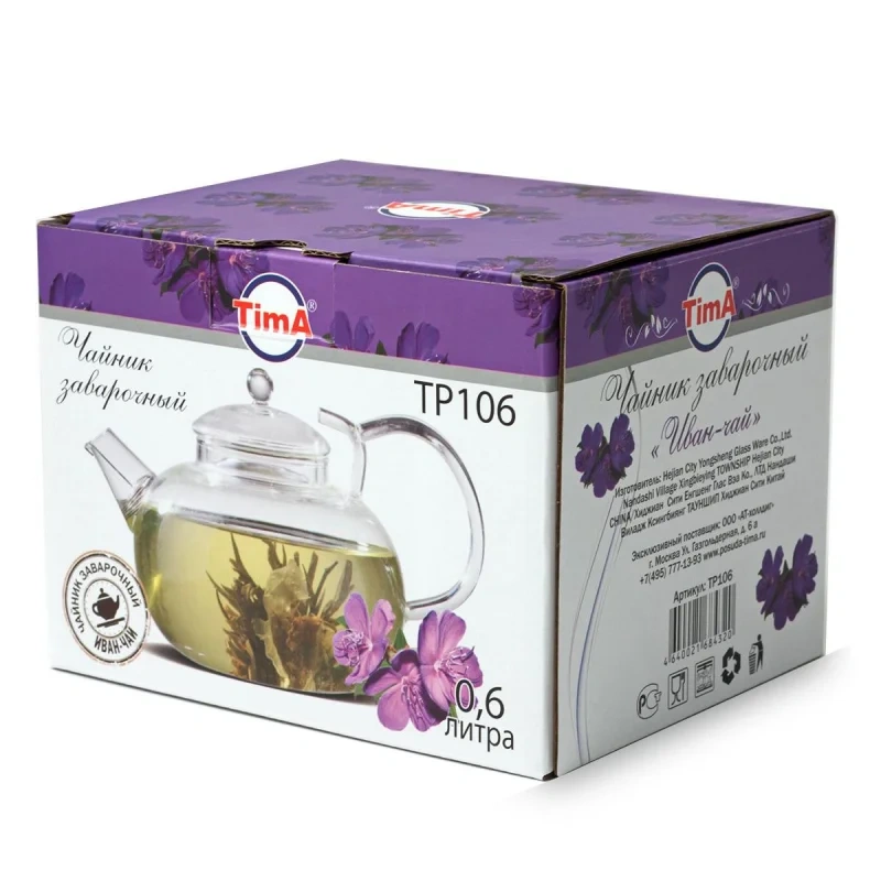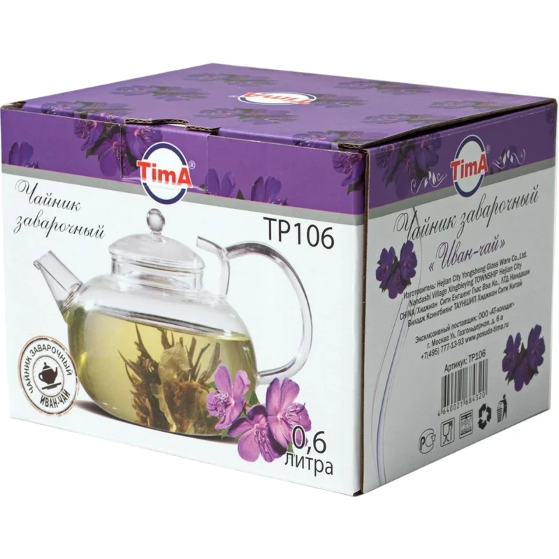 Чайник заварочный 600мл стекл. ИВАН-ЧАЙ (пружина в носике) (TP106) Чайник заварочный Tima Иван-чай TP106 стеклянный/нержавеющая сталь 600 мл Чайник заварочный Tima Иван-чай выполнен в классическом стиле. Корпус чайника изготовлен из боросиликатного стекла. Длинный носик позволяет быстро и без усилий разлить чай в чашки. Специальная форма носика не дает образовываться нежелательным каплям. Стекло - абсолютно инертный материал не вступает в контакт с содержимым, никак не влияет на вкус и аромат напитка, не боится кислот. Заварочные чайники, изготовленные из стекла, подходят для всех видов и сортов чая, а также травяных и фруктово-ягодных напитков, какао и кофе. Можно использовать для молока и бульонов. Преимущества стеклянных чайников: - экологичность, стекло не вступает в химическую реакцию с водой или смесями для заварки, поэтому сам корпус прибора никак не влияет на вкусовые качества напитка, - стекло легко мыть, это можно делать даже в посудомоечной машине и применять жесткие абразивы, - полотно стекла не способно впитывать другие запахи, поэтому вкус напитка всегда остается неизменным, - стеклянные модели всегда вписываются в сервировку и не будут выделяться даже на фоне сервиза, как это может быть с чайниками из фарфора или глины. Объем: 600 мл.