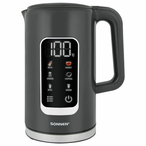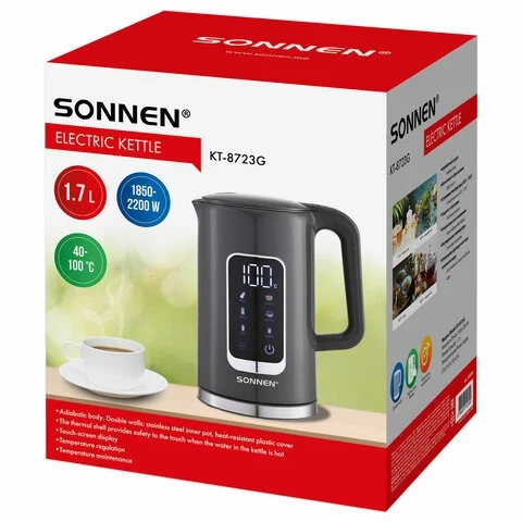 Чайник с терморегулятором и дисплеем, ДВОЙНЫЕ СТЕНКИ, SONNEN KT-8723G, 1,7л, 2200Вт, серый, 454690