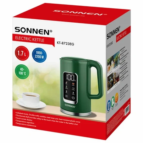 Чайник с терморегулятором и диплеем, ДВОЙНЫЕ СТЕНКИ, SONNEN KT-8723EG, 1,7л, 2200Вт, изумрудный, 454