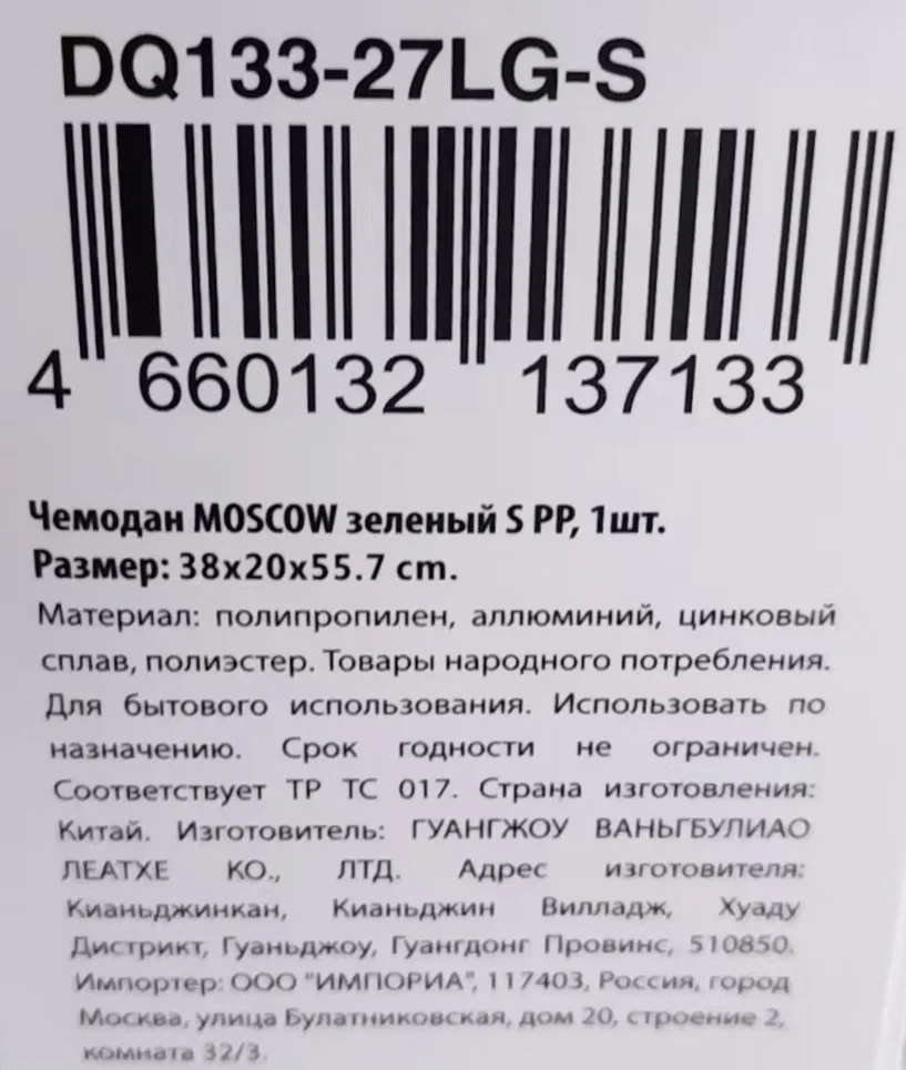 | Комплектация | чемодан - 1 шт. |