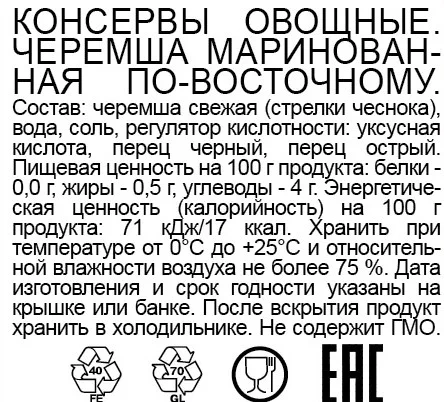 Черемша Скатерть-Самобранка, маринованная по-восточному – это пикантная закуска, которая отлично подходит к праздничному столу. В этом ароматном растении содержится множество полезных витаминов и минералов. Например, очень большое количества витамина С, который необходим для поддержания иммунитета, а так же витамины А и В, цинк, железо, бор и незаменимые аминокислоты. Употреблять черемшу можно в самых разных видах – целой или нарезанной, прямо из банки или дополнительно её обжарив. Можно использовать её для приготовления закусок и бутербродов, добавлять к рыбе и мясу и даже начинять ей пироги.