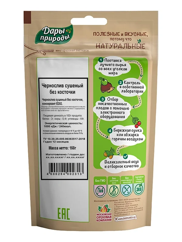 Чернослив Дары природы сушеный без косточек, 150 г – это полезный сухофрукт. Он имеет очень мягкую мякоть, внутри которой нет косточки. Чернослив содержит в себе большое количество антиоксидантов, пищевые волокна, сорбит и изатин. Он известен своим слабительным действием. Часто его используют для регулирования работы пищеварительной системы. Перекус черносливом приносит быстрое чувство насыщения и уменьшает последующее количество потребления пищи, помогая контролировать переедание. Чернослив выступает неотъемлемым ингредиентом в различных сытных и фруктовых салатах, а также в десертах. В него кладут грецкий орех и сверху делают шапочку из нежным взбитых сливок. Чернослив вместе с курагой и цедрой лимона перекручивают на мясорубке и формируют небольшие шарики, которые прекрасно заменяют собой высококалорийные конфеты. Представленный продукт поставляется в удобной для транспортировки и хранения упаковке. Дары природы: Сливу для чернослива мы выращиваем сами на своих полях в Ростовской области. Потом сами ее сушим, удаляем косточку и фасуем уже готовый чернослив. Мы полностью, от ветки до пакета, контролируем отменное качество нашего продукта. Наш чернослив просто тает во рту и является настоящим кладезем полезных веществ.