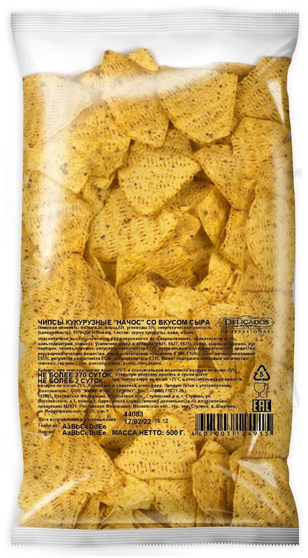 Насладись аутентичными мексиканскими Delicados Nachos с разнообразными вкусами и наполни свою жизнь яркими, позитивными эмоциями! Чипсы Delicados Nachos кукурузные с нежнейшим сыром, 500г – это классические начос в сочетании с насыщенным сырным вкусом. Чипсы изготовлены исключительно из цельного зерна кукурузы, сваренного по особой технологии и размолотого каменными жерновами, с обжаркой на высокоолеиновом подсолнечном масле. Такой способ производства придает нашим хрустящим начос особый вкус!
