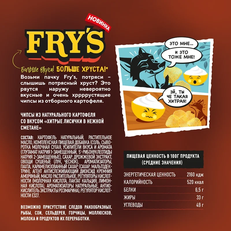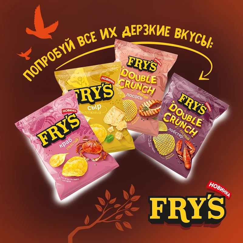 Возьми пачку Fry’s, потряси – слышишь потрясный хруст? Это рвутся наружу невероятно вкусные и очень хррррустящие чипсы из отборного картофеля. Fry’s Нежная сметана и игривая зелень – чипсы с нежным сливочным вкусом и игривым ароматом зелени, которые оставят яркое послевкусие. Больше вкуса, больше хруста!