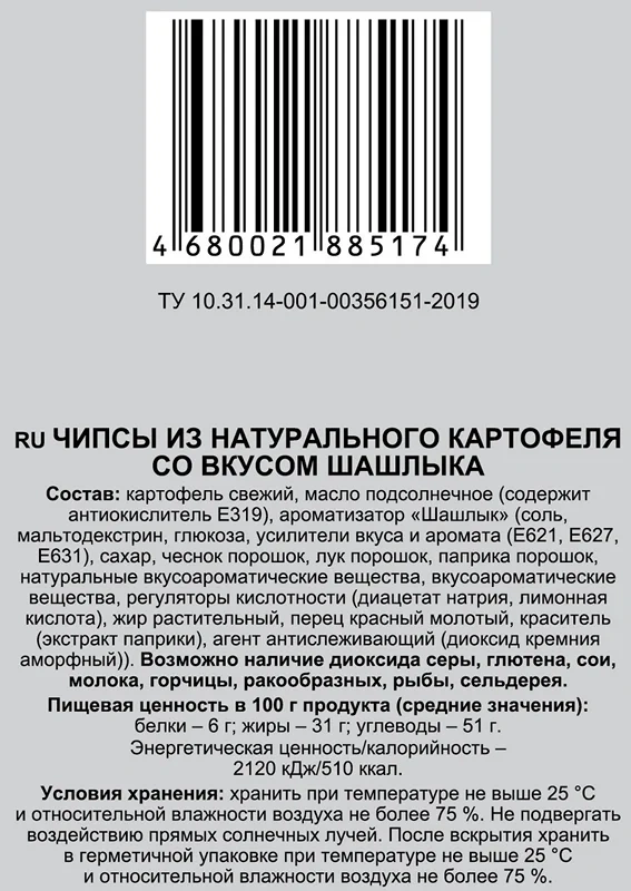 Картофель свежий, масло подсолнечное (содержит антиокислитель Е319), ароматизатор Лук со сметаной (мальтодекстрин, соль, сахар, лук порошок, усилитель вкуса и аромата: Е621; петрушка зелень сушеная, жир растительный, вкусоароматические вещества, регуляторы кислотности (Е270, Е327, Е334), куркума молотая, натуральные вкусоароматические вещества, краситель: Е160с; агент антислеживающий: диоксид кремния аморфный).