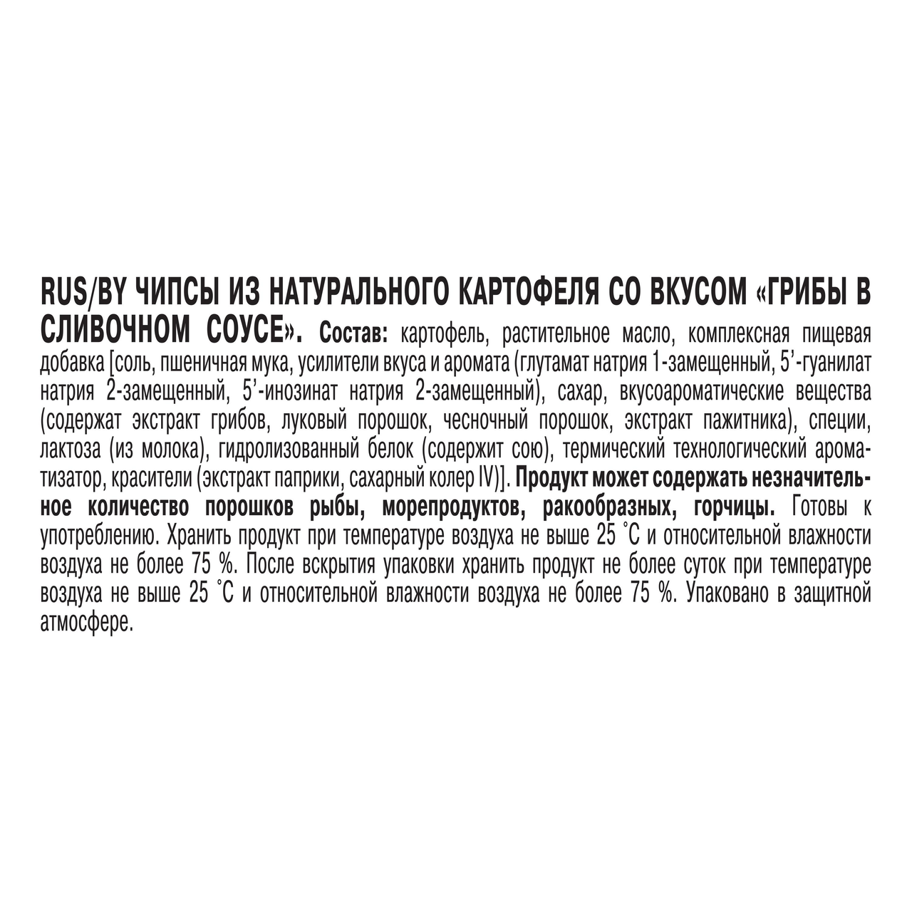 Чипсы LAYS МАХХ Грибы и сливочный соус — обладают нежным сливочно-грибным вкусом. Они приготовлены из отборного картофеля с добавлением ароматных специй. Рифленая форма придает аппетитный вид и делает вкус еще более насыщенным. Хрустящие дольки нежно тают во рту. Это отличный перекус для всех. Торговая марка: Lays.Страна: Россия.Сырье: картофель.Вес: 145 г.Состав: картофель, растительное масло, комплексная пищевая добавка (соль, пшеничная мука, усилитель вкуса и аромата (глутамат натрия 1-замещенный, 5-гуанилат натрия 2-замещенный, 5-инозинат натрия 2-замещенный), сахар, вкусоароматические вещества (содержат экстракт грибов, луковой порошок, чесночный порошок, экстракт пажитника), специи, лактоза (из молока), гидролизованный белок (содержит сою), термический технологический ароматизатор, красители (экстракт паприки, сахарный колер.