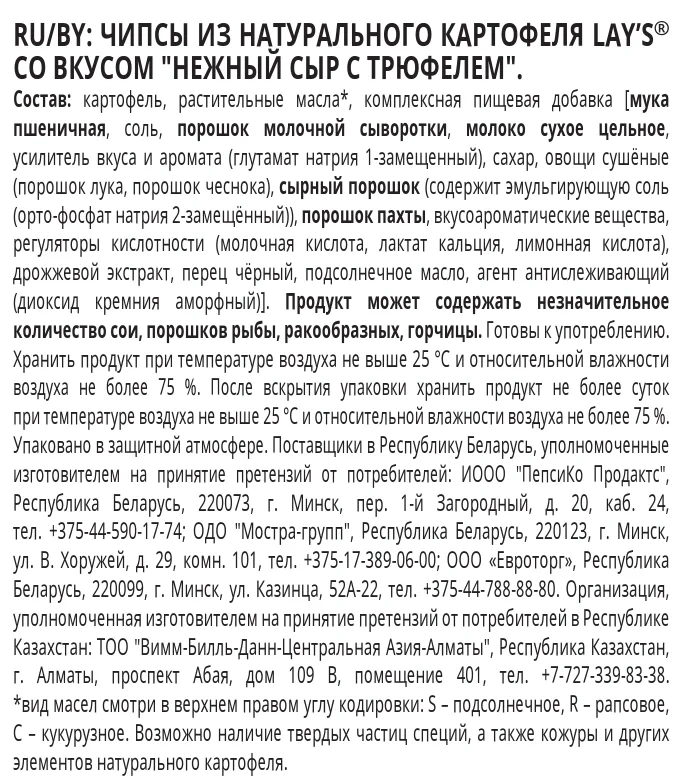 Картофель, растительные масла, комплексная пищевая добавка мука пшеничная, соль, порошок молочной сыворотки, сухое цельное молоко, усилитель вкуса и аромата глутамат натрия (1-замещенный), сахар, сушеные овощи (порошок лука, порошок чеснока), сырный порошок, содержит эмульгатор соль ортофосфат натрия (2-замещенный), порошок пахты, вкусоароматические вещества, регуляторы кислотности (молочная кислота, лактат кальция, лимонная кислота), дрожжевой экстракт, перец черный, подсолнечное масло, агент антислеживающий диоксид кремния аморфный.
